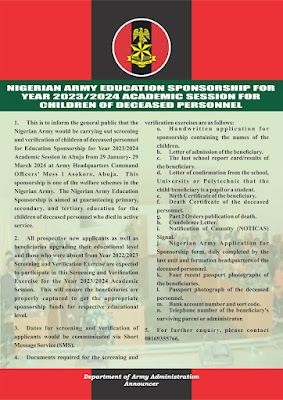 The Nigerian Army says it will conduct the screening and verification of children of deceased personnel for the award of scholarships.